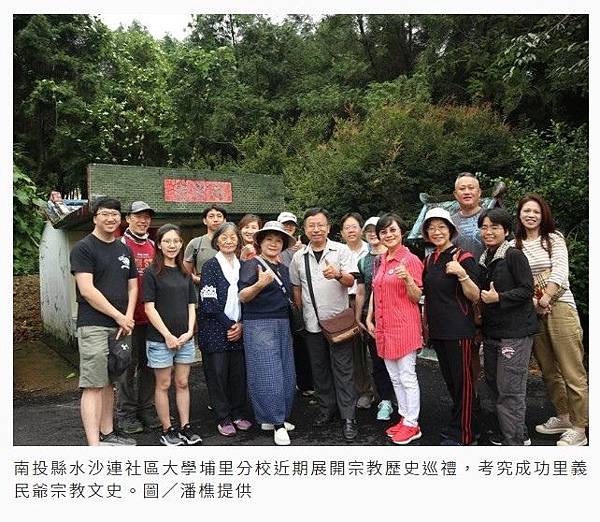 南投縣水沙連社區大學指出,為打造樂活城鎮藝文,水沙連社大今年將生態保育融合客家文化、地方文史等開辦「埔里地區小旅行」課程,透過室內講解和戶外走讀探勘帶學員親近自然,並學習人文觀念和常民知識,宗教歷史也是重要一環。