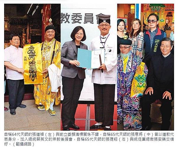 自稱64代天師的張道禎(左)與前立委顏清標關係不錯,自稱65代天師的張意將(中)曾以道教代表身分,加入總統蔡英文的宗教後援會,自稱65代天師的張捷翔(右)與統促黨總裁張安樂交情好。(翻攝網路)