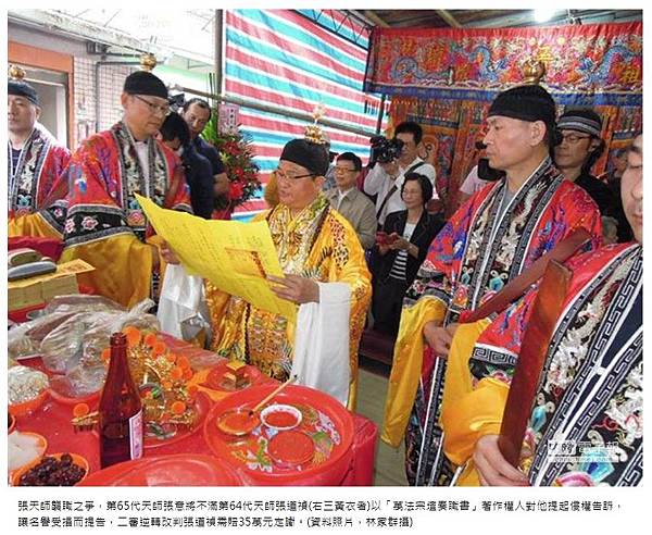 張天師襲職之爭,第65代天師張意將不滿第64代天師張道禎(右三黃衣者)以「萬法宗壇奏職書」著作權人對他提起侵權告訴,讓名譽受損而提告,二審逆轉改判張道禎需賠35萬元定讞。張天師告張天師 張道禎判賠35萬 - 社會 - 中時 https://bit.ly/30iTwTD