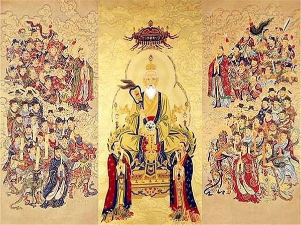 第三等以太極金闕帝君為主神。太極金闕帝君俗姓李,曾下降到人間當上了道教一大派別太平教的教主。這一等中世俗人間氣息較濃,左右兩邊有不少是歷史上真實存在的人物。左邊太極左真人中央黃老君以下有:君喜、龔仲陽、龔幼陽、安期生、葛玄、孔子、顏回、黃帝、顓頊,帝嚳,堯,舜、禹、巢父,周穆王、許由等50餘位。右邊太極右真人西梁子文以下有:范明期、裴玄仁、司馬季主、張奉、莊子、老子,秦佚,庚桑子,蕭史,弄玉等30餘位。他們中的有些是傳說中的歷史人物,但與神活虛幻的神仙是不同的,至少他們的一些事跡被載入古代史書上,而且古人也基本相信這些傳說中的歷史人物的確真實地存在過。這種由人鬼神構成的神靈體系也反映了道教天地人合一的哲學思維模式。