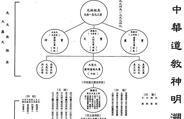 第一等級以元始天尊為主神,他居住在天界最高的仙境「玉清」。相傳他在形成天地萬物的自然元氣之前出生,故稱作「元始」。第四等級以太上老君(老子)為主神。在此圖譜中,老子的身分地位有所下降,從原先道教中的萬神之宗主下跌為「下臨萬民」的「太清道主」了。