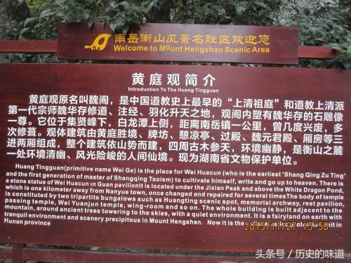 黃庭觀在道教中的名望很高。 其原因主要是由於東晉鹹和九年(西元三三四年),著名的女道士南嶽魏夫人在禮鬥壇白日飛升成仙。 魏夫人名華存,字賢安,山東任城人,東晉司徒劇陽文康公魏舒的女兒。 幼年時便熟讀"莊老之書","篤意求神仙之術",發誓不嫁。 後來在父母的脅迫下,二十四歲時嫁給南陽劉幼彥,生二子,長名璞,次名瑕。 據《南嶽志》記中所錄的《南嶽魏夫人傳內傳》雲:婚後,華存夫人時常"閑齋別寢,入室百日不出",每日念經修道。 傳說由於精誠所至,感動上天,四位仙君在同一天降臨到她家裡,授她《太上寶文》、《八素隱書》三十一卷和《黃庭經》。 她得到經卷後,日夜誦讀,潛心修行。 丈夫死後,天下大亂,攜帶二子渡江南行。 爾後又與二子分開,與侍女麻姑於晉大興年間來到南嶽,在集賢峰下,結草舍居住,靜心修道。 這就是黃庭觀的來由。 在她修行的十六年中,傳說西王母曾約請她到朱陵山上一起吃靈瓜,八十三歲時,即晉成帝鹹和九年(西元三三四年)間,她閉目寢息,飲而不食",七天後一天夜裡,被西王母派眾仙來迎接她升天。