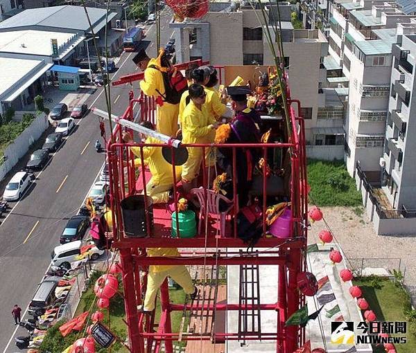 ▲碩士道長蕭道賢獲祖師爺指示,由十多位法師登上刀梯最高層,給予頂禮最高禮數。(圖/記者金武鳳攝,2021.10.30)© 由 NOWnews 提供 ▲碩士道長蕭道賢獲祖師爺指示,由十多位法師登上刀梯最高層,給予頂禮最高禮數。(圖/記者金武鳳攝,2021.10.30)