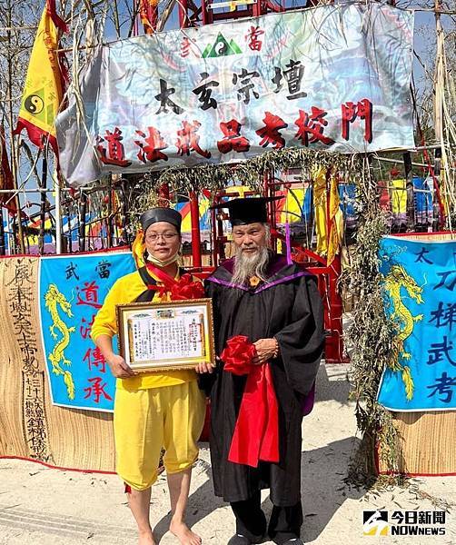 至於最吸睛的,莫過於蕭道賢親自上場的受禮儀式。蕭道賢投入道教文化傳承逾30年,2年前,儘管已年高76歲,因自覺學識不足,秉持活到老學到老精神,報考玄奘大學宗教與文化學系碩士班,獲錄取成為該系最年長的研究生,一時傳為美談。