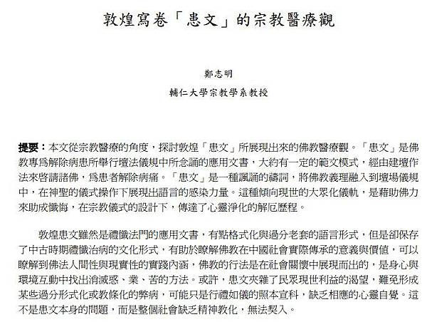 摘要 本文從宗教醫療的角度,探討敦煌「患文」所展現出來的佛教醫療觀。「患文」是佛教專為解除病患所舉行壇法儀規中所念誦的應用文書,大約有一定的範文模式,經由建壇作法來啟請諸佛,為患者解除病痛。「患文」是一種諷誦的禱詞,將佛教義理融入到壇場儀規中,在神聖的儀式操作下展現出語言的感染力量。這種傾向現世的大眾化儀軌,是藉助佛力來助成懺悔,在宗教儀式的設計下,傳達了心靈淨化的解厄歷程。 敦煌患文雖然是禮懺法門的應用文書,有點格式化與過分老套的語言形式,但是卻保存了中古時期禮懺治病的文化形式,有助於瞭解佛教在中國社會實際傳承的意義與價值,可以瞭解到佛法人間性與現實性的實踐內涵,佛教的行法是在社會關懷中展現而出的,是身心與環境互動中找出消滅惑、業、苦的方法。或許,患文夾雜了民眾現世利益的渴望,難免形成某些過分形式化或教條化的弊病,可能只是行禮如儀的照本宣科,缺乏相應的心靈自覺。這不是患文本身的問題,而是整個社會缺乏精神教化,無法契入