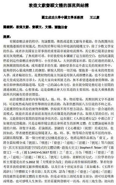 學者總想把握隨著人、地、時、事、物等場合而變易不居的齋醮法會內容,試圖以簡馭繁。郝春文將這類作品稱為「齋文」,並將全篇結構分成「號頭」、「嘆德」、「齋意」、「道場」、「莊嚴」、「號尾」等六個部分。其次宋家鈺則謹守四段式的文體結構。最後太史文(Stephen F. Teiser)將「《雜齋文》一本」之「患文」分為「嘆德」、「齋意」、「患者」、「道場」、「莊嚴」、「願文」、「號尾」七部分,並解析其句式。三位學者的分析主要還是出於S.2832 號「夫嘆齋分為段」的啟示再作細部的調整。筆者則參考眾多敦煌齋願文獻和傳統載籍,以及日本10 世紀末的作品:「真如藏本‧《玉澤不渴鈔》」「序體願文十番目錄」及其文例,認為「嘆德」、「齋意」、「道場」、「莊嚴」四段雖然是齋願文體的主要內容,但是必須加上頭尾及齋主部分,頭可以是嘆佛或嘆德,也可感嘆人生無常;至於莊嚴與發願可一而再,再而三地生發;迴向的對象從諸神佛到齋主,以及死去親人或生靈,都可含括在內。因此勿論齋醮法會的整體流程是繁複還是簡略,時間或長或短,完全以齋會的類別與規模、齋主的地位、齋襯的多寡而定。甚至從傳統文獻,以及南唐‧釋應之《五杉練若新學備用》卷下自述的作意及〈道場齋疏并齋文〉文例,說明10 世紀中葉以後,從齋願文中分出部分內容,先向神佛表白,讀誦鋪排物件的簡短疏文,有如日本「諷誦體願文」的結構樣式,以迄於明清以來的齋疏文體號無兩樣,更與目前越南、臺灣的法會疏文結構樣式類似。