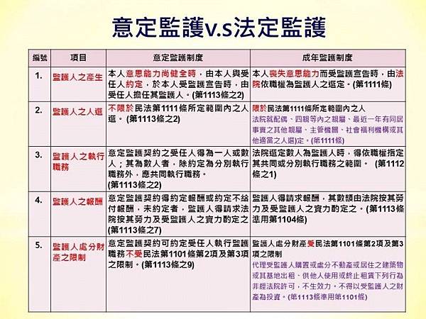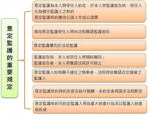 1. 民法新增第1113-2條至第1113-10條有關成年人之「意定監護」制度,主要係以契約方式預先指定本人之監護人,在未來本人如果有因精神障礙或其他心智缺陷,致不能為意思表示或受意思表示,或不能辨識其意思表示之效果之情形時,就可以由法院裁定由當初本人自己選定的意定監護受任人來擔任自己的監護人。意定監護,是本人(委任人)與受任人約定,當受到監護宣告時,受任人便可擔任監護人的契約,而這個受任人可以是一人或數人(第1113-2條);意定監護亦可撤銷。