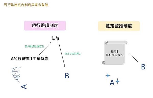 意定監護制度的修法,很大程度就是要解決上述幾個問題。所謂意定監護,意思就是讓A在患病以前,就先以書面方式指定自己未來如果陷入精神障礙或心智缺陷,要由B來擔任他的監護人。在未來如果A真的因為患病而導致生活無法自理時,B就可以直接向法院聲請監護宣告,而法院的審查也是以A的意思為準,直接選任B做為監護人。一方面可以減少審查時間,另一方面也可以比較尊重A本身的意願,更減少家族內部為了爭奪監護人地位的糾紛。