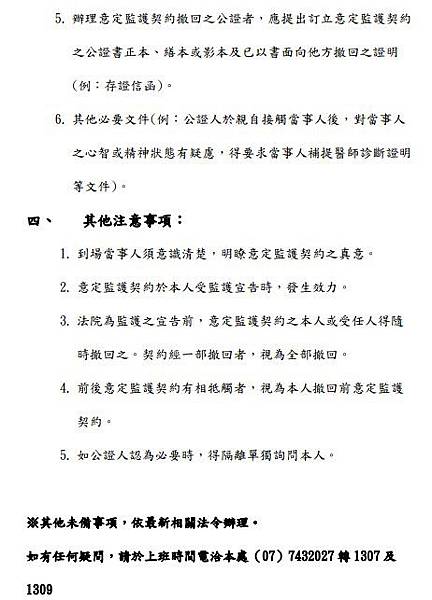 3. 本人及意定監護的受任人,需至公證人處完成公證程序,公證人做成公證書後七日內,以書面通知本人住所地之法院。(第1113-3條)