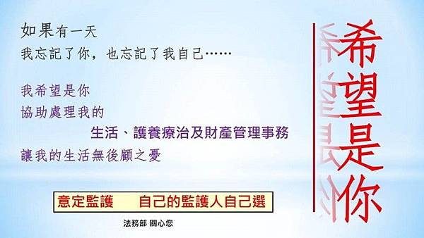 小時候我們有爸爸媽媽協助,在我們老的時候,該怎麼辦呢?當我們已經記不起眼前的人?不知道怎麼去銀行領錢?更怕的是如果有詐騙集團如果利用我失智,擅自處分我的財產,我究竟該怎麼辦?