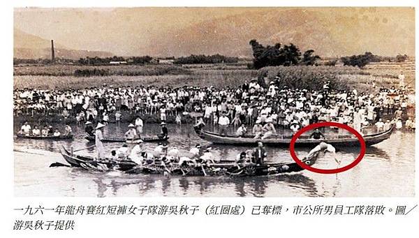 一九六一年龍舟賽紅短褲女子隊游吳秋子(紅圈處)已奪標,市公所男員工隊落敗。圖╱游吳秋子提供