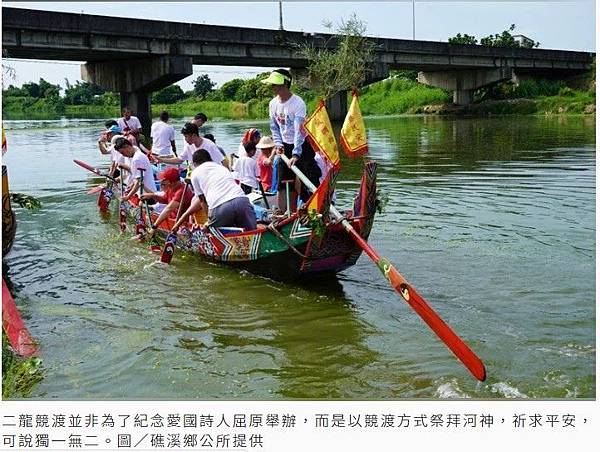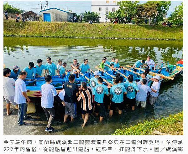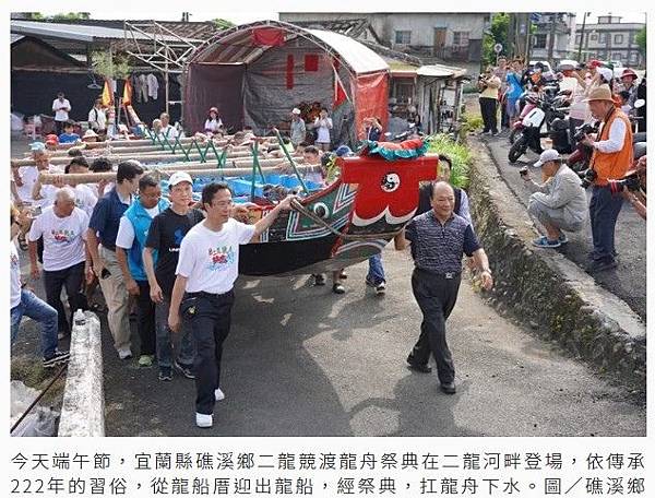 今天端午節,宜蘭縣礁溪鄉二龍競渡龍舟祭典在二龍河畔登場,依傳承222年的習俗,二龍河畔的淇武蘭、洲仔尾兩庄庄民從龍船厝迎出龍船,經絞船、絞尾槳、力度、插順風旗、艾草、淨香祭拜後,沾硃砂點睛,沿途敲鑼,扛龍舟下水,在二龍河上獻紙頭,展開競渡,特別的是,二龍競渡並非為了紀念愛國詩人屈原舉辦,而是以競渡方式祭拜河神,祈求平安,可說獨一無二。
