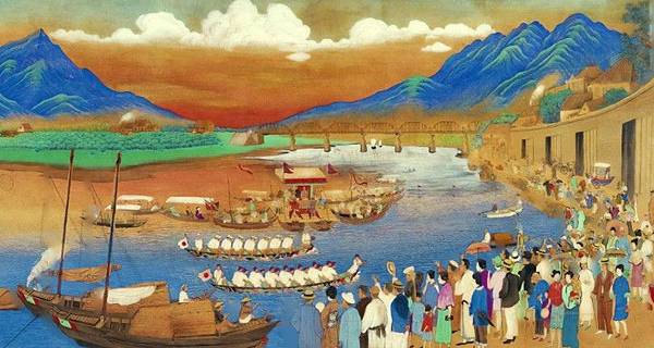 背景的臺北橋畫得很完整,淡水河中有重點的扒龍船、遊湖、唱戲等活動