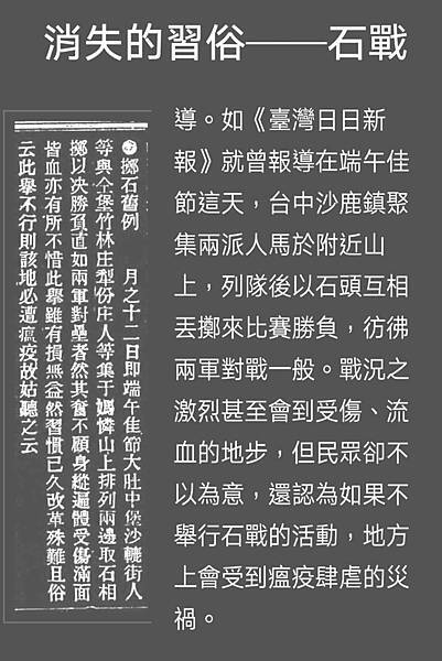 在日本殖民者禁止這種做法之前, 臺灣人曾經在端午節的史詩般的攤牌中互相扔石頭