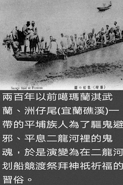 其實台灣平埔族也曾有類似賽龍舟的競渡儀式,其中較知名的是宜蘭礁溪二龍村的龍舟賽會。以下引述「走讀宜蘭-節慶」網站:
