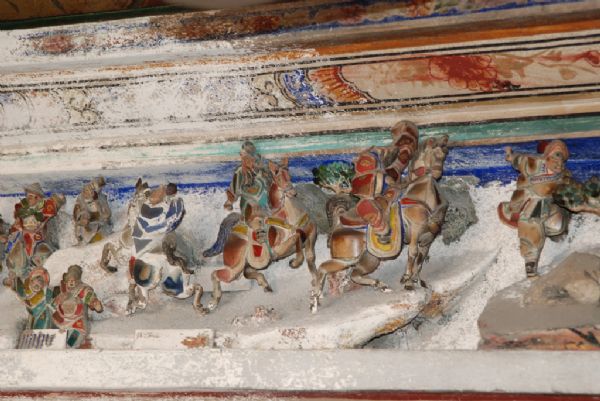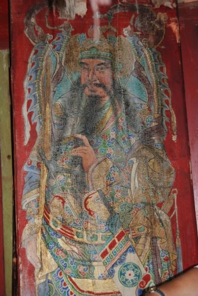圖中下方右邊拱手作揖的便是西伯侯姬昌,左邊坐在溪畔作垂釣貌的便是姜子牙,可惜垂釣的手受外力破壞而斷裂。