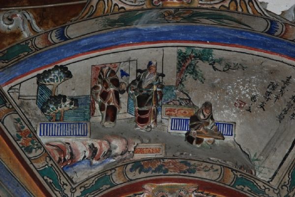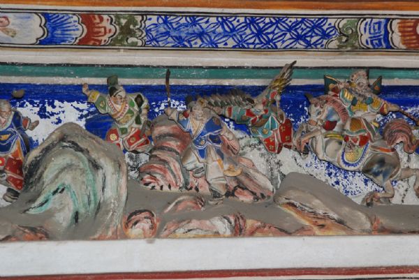 身堵鏤雕著「四聘」之中的故事,分別是龍爿的「渭水聘賢」以及虎爿的「三顧茅廬」。「渭水聘賢」講的是周文王姬昌親往渭水延聘姜子牙的故事;商代末年,紂王無道,民不聊生,天下諸侯紛紛起兵造反,當時擔任西伯侯的姬昌心中便盤算要起兵推翻商紂,一統天下。之後姬昌聽聞隱居在渭水畔的姜子牙深具才能,於是親自前往延聘。姜子牙,姓姜,氏呂,名尚,字子牙。根據《封神演義》的故事情節,姜子牙曾擔任商代的一名小官,見政局腐敗而辭官歸隱,在渭水畔以無鉤的金屬絲釣魚,是故諺語謂「姜太公釣魚,願者上鉤」。傳說姜尚答應出仕的時候,姬昌親自為他拉車,一連走了約八百步,姜子牙據此斷定周代國祚可享八百年。