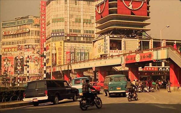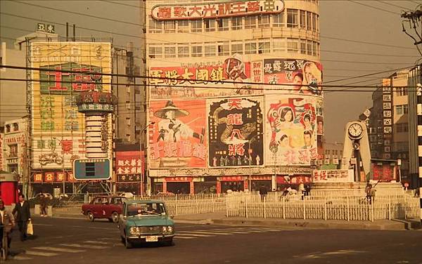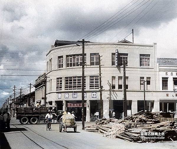 戰後1950臺中 中央書局 景象數位上色,地點位於今臺灣大道、市府路交叉口,拍攝時前方有板車、軍車通過。