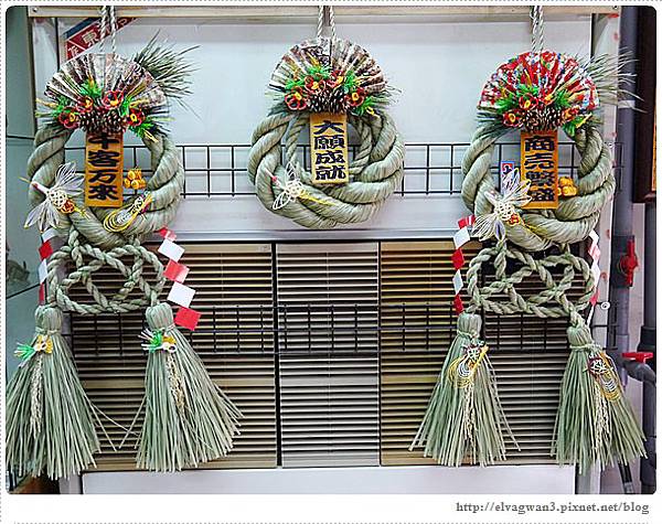 注連繩是日本掛在神社鳥居上,顯示神與人之間的區隔 以及新年掛在門前、玄關或是裝飾於室內,是趨吉避凶 的象徵物。經過數百年沿襲,目前婚喪喜慶活動的周邊 環境或車內,都有懸掛此物