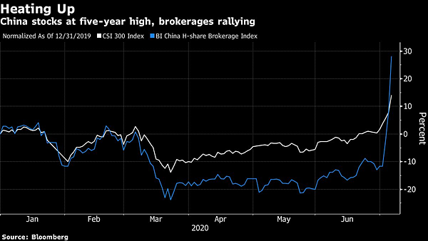 低利率和某些流行理財產品的虧損驅使中國儲戶將資金投向股市。官媒的熱情唱和也起到推波助瀾的作用。 周一《中國證券報》頭版評論文章稱,「後疫情時代,經濟系統比以往任何時候都更加需要股市‘健康牛’」。中國社交媒體上有關「開戶」的搜索量激增,看漲人氣還推高了人民幣匯率 。