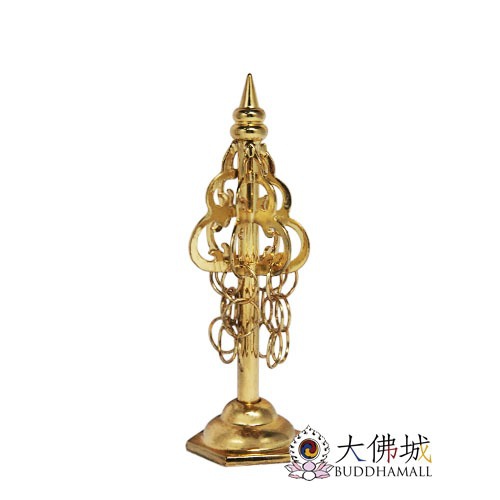 錫杖這件法器,好像跟其它的法器,還有點觀感上的一種魅力吧。總之是上面的這個環造型非常優美,有的是兩股六個環,有的是四股十二個環。而且這個環掛在那兒,走起來呢,還叮噹叮噹的響。
