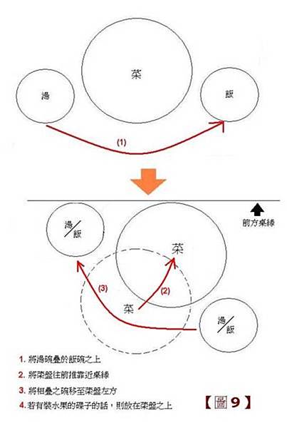 同學問:盛開水的碗所放位置,要比加飯時的位置,還要再前面一點(如【圖8】)?