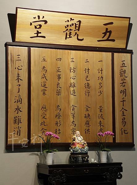 牌匾的左右還有兩句話︰「五觀若明千金易化,三心未了滴水難消」,意思是︰若在用齋時正念進食、食存五觀,再難消化的食物也能好好消化;而如果用齋時任由過去心、現在心、未來心雜亂作用,即使只是一滴水,恐怕也難以好好地被身體所吸收消化。