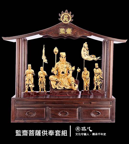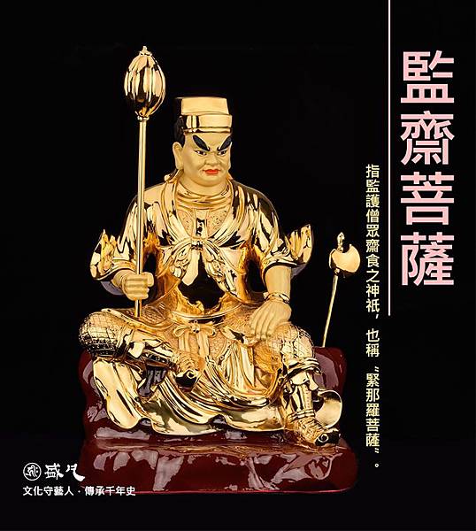 監齋菩薩是佛教護法天龍八部之一,又稱緊那羅王菩薩,也名監齋使者,是專為監護僧眾齋食之神。監齋菩薩護持寺院,護持常住,使僧眾柴米無憂,於飯食中常存五觀,獲得法喜禪悅之味,清淨修行。佛門有「三千諸佛皆出在廚中」之說,廚房雖然是苦行地但卻是成佛作祖之地。如法辦造飲食,奉佛供僧者,謂之大慈悲菩薩。