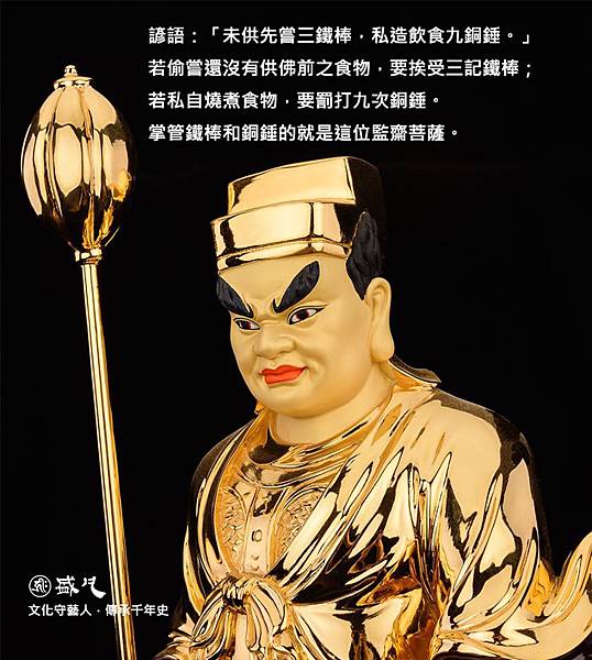 寺院大寮中常會聽到一句話:「未供先嘗三鐵棒,私造飲食九銅錘。」若偷嘗還沒有供佛前的食物,要挨受三記鐵棒;若私自燒煮食物,要罰打九次銅錘。掌管鐵棒和銅錘的就是這位監齋菩薩。
