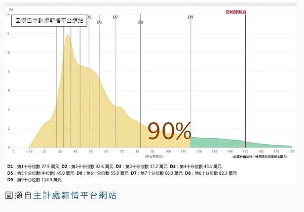 但倘若以「個人薪資」來看,假設300萬為雙薪家庭,則一人年薪150萬,根據行政院主計處的「薪情平台」,年薪150萬超過90%的全體受雇人員,已達台灣的頂標等級,絕非鄉民口中的「普通」程度。家庭年收入300萬鄉民狂喊「普通」等級 真實答案揭曉 | 鄉民爆報看 | Oops | 聯合新聞網 https://bit.ly/3iQPgS7