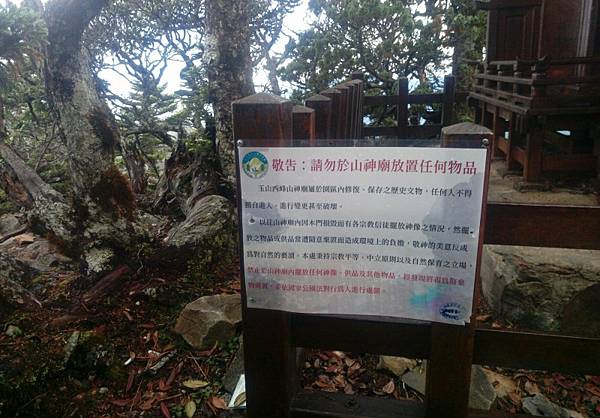 玉山國家公園西峰有座全台最高山神廟,周邊則有公告禁止在山神廟放置物品。(玉管處提供)