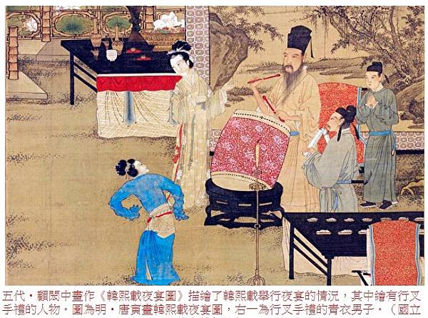 五代‧顧閎中畫作《韓熙載夜宴圖》描繪了韓熙載舉行夜宴的情況,其中繪有行叉手禮的人物。圖為明‧唐寅畫韓熙載夜宴圖,右一為行叉手禮的青衣男子。(國立故宮博物院)