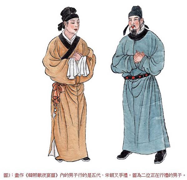 唐朝之後的五代、宋時期,叉手禮的行法與唐代相同,但手勢稍有變化,雖然也是兩手交於胸前,左手握住右手,但左、右手的大拇指皆上翹,《韓熙載夜宴圖》中所繪的幾位行叉手禮之人都是這種手勢。見示意圖(圖3)(圖4)。