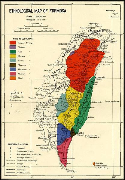 日治時期福爾摩沙人種學地圖 由上而下依序為: 泰雅族 賽夏族 阿美族 布農族 鄒族 普優馬 澤利先 排灣族 雅美族