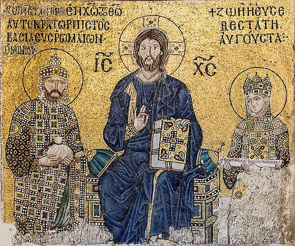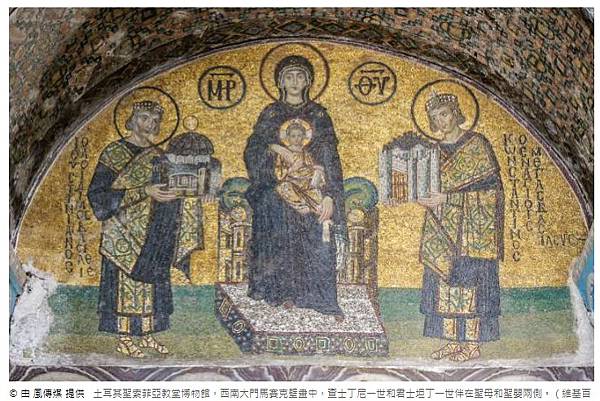 土耳其聖索菲亞教堂博物館,西南大門馬賽克壁畫中,查士丁尼一世和君士坦丁一世伴在聖母和聖嬰兩側。(維基百科公有領域)© 由 風傳媒 提供 土耳其聖索菲亞教堂博物館,西南大門馬賽克壁畫中,查士丁尼一世和君士坦丁一世伴在聖母和聖嬰兩側。(維基百科公有領域)