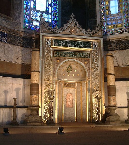 奧斯曼土耳其人在1453年征服君士坦丁堡,蘇丹穆罕默德二世下令將大教堂轉變為清真寺[9],還將鐘鈴、祭壇、聖幛、祭典用的器皿移去,用灰泥覆蓋基督教鑲嵌畫[10]。日後又逐漸加上了一些伊斯蘭建築,如米哈拉布、敏拜爾及外面的四座叫拜樓。