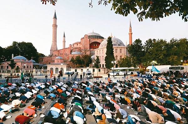 土耳其總統厄多安十日宣布,將聖索菲亞大教堂改為清真寺,大批穆斯林聞訊在教堂外舉行晚禱。(路透)