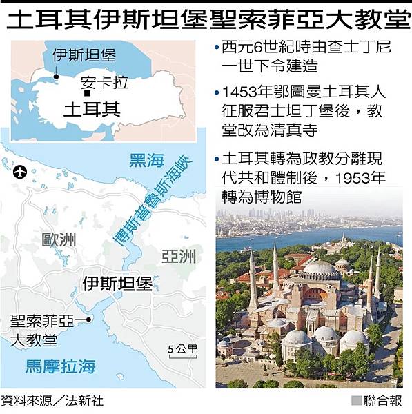 土耳其最高行政法院十日判決,實施八十六年、將伊斯坦堡聖索菲亞大教堂轉為博物館的部長會議決定無效,土耳其總統厄多安隨即下令將教堂改為清真寺。此一決定讓這座曾為東正教教堂及伊斯蘭教清真寺的歷史建築再陷宗教爭議,引發宗教人士及歷史學家批評厄多安將文化遺產作為政治工具。