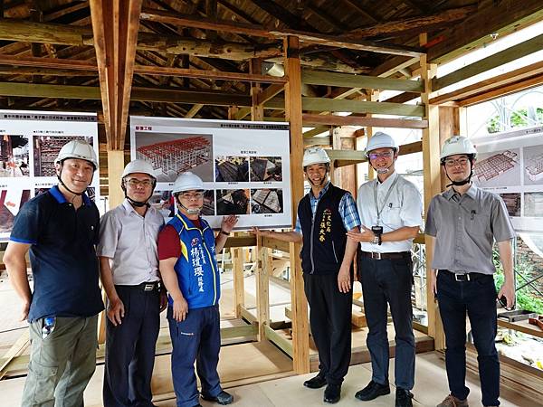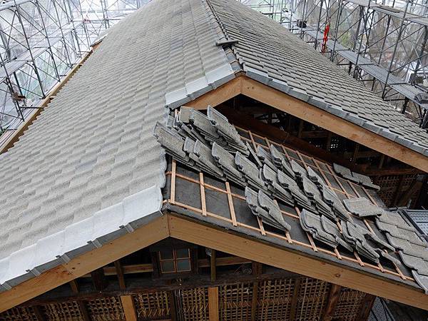同時,修復團隊為了重建五棟建築的屋頂結構,在現場搭設模型進行試作,依循傳統工法,依序搭建桁條、桷木、屋面板,之後鋪上油毛氈或檜木皮做為防水層,頂層敷上屋瓦。