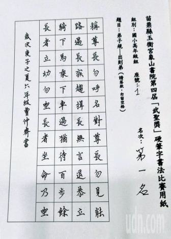 頭屋鄉玉衡宮、苗栗縣象山書院學會推廣漢學精粹文化與文字美學,12日辦第4屆「武聖獎」苗栗縣硬筆字書法比賽,今年初賽共收到610件作品,學子參賽踴躍。(何冠嫻攝)修養氣息「武聖獎」硬筆字書法比賽 激勵學子寫好字 - 寶島 - 中時 https://bit.ly/2OjxBVg