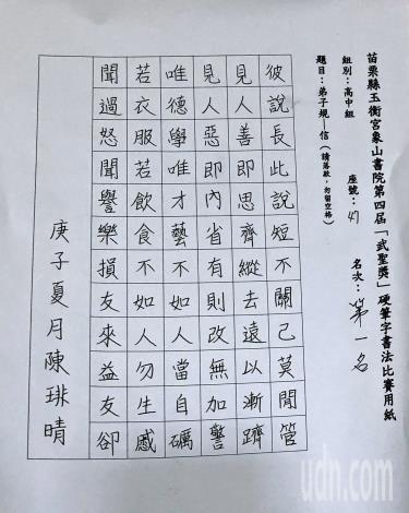 19:052020/07/12 中時 何冠嫻修養氣息「武聖獎」硬筆字書法比賽 激勵學子寫好字 - 寶島 - 中時 https://bit.ly/2OjxBVg