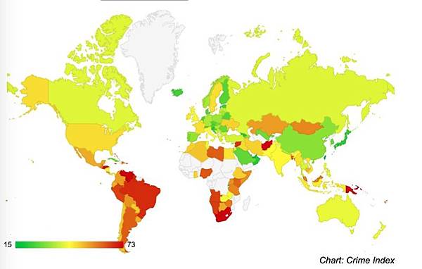 Numbeo表示,指數低於20分的國家屬犯罪率極低,高於80則屬極高。犯罪率前三名依次為委內瑞拉(84.36)、巴布亞新幾內亞(80.04)、南非(77.29)。