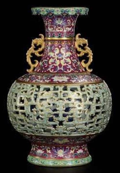 一只清乾隆年間製造的「洋彩紅地錦上添花冬青玲瓏夾層瓶」,昨天在香港蘇富比中國藝術珍品春拍拍出新台幣2.7億的天價(港幣70406000元)。此瓶在歐洲中部一個偏遠的鄉間別墅被發現,繼承此瓶的老太太將這隻瓶子收藏於別墅內,與貓狗寵物同居逾50年,發現時仍完好無缺。