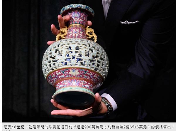 國際拍賣公司蘇富比日前拍賣18世紀一只珍貴花瓶,這個花瓶原本屬於中國清代乾隆皇帝,藏於北京紫禁城的乾清宮,過去50年則藏在歐洲中部偏僻鄉間一位80歲老婦的屋子裡,並幸運躲過老婦養的貓狗「蹂躪」,完好無缺,最後以逾900萬美元(約新台幣2億6847萬元)天價落鎚售出。