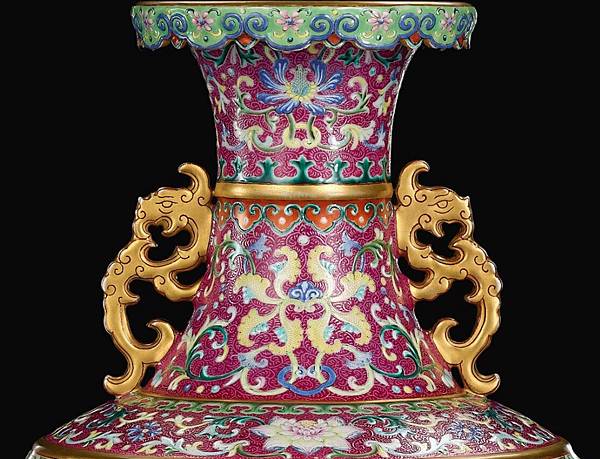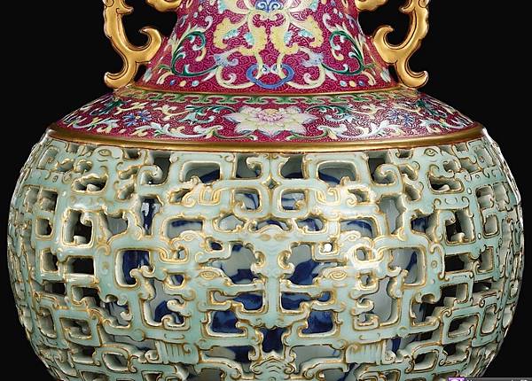 此瓶由御窰督陶官唐英治下所製。據乾隆七年「活計檔」記錄,此瓶獲帝皇稱許,納入「乾清宮頭等」。乾清宮居內廷之冠,乃聖上詔見使臣、內宮宴筵之重要宮殿。此瓶是孤品,從未成雙燒造,其製作繁複,燒造艱難,是有史以來市場上造工最精緻繁複的乾隆珍品之一,在鄉郊別墅與寵物共寢半世紀後依舊完好無缺,也算是奇蹟。