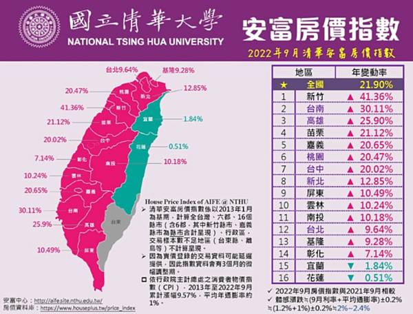 公布2022年9月【縣市】清華安富房價指數 HPI of AIFE has been launched on October 27, 2022.
