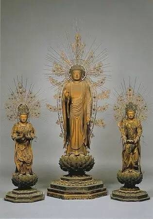 此阿彌陀三尊像為日本光明皇后之母橘夫人所造之念持佛像。 指安置於法隆寺金堂之橘夫人念持佛櫥子內的阿彌陀三尊像。 該櫥子高二點六三公尺。 框座上部與該寺金堂之天蓋同形。法隆寺橘夫人念持佛阿彌陀三尊像。