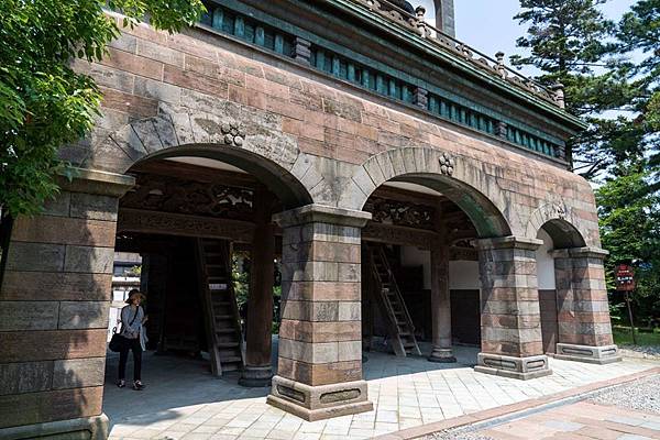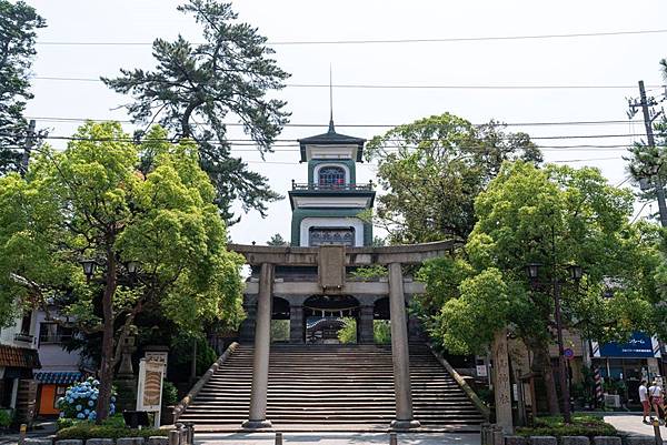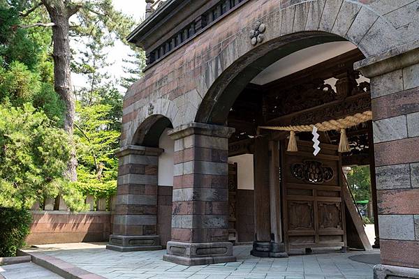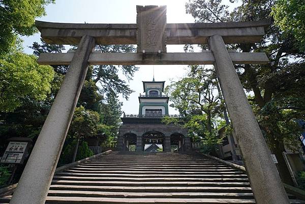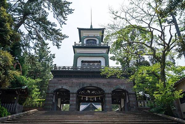 尾山神社建於1873年(明治6年)而這棟神社神門建於1875年(明治8年),神門概念是將獻燈結構抽象化,再由西方風格設計創作而成的作品,而第三層,裝設了「ギヤマン」的彩繪玻璃,夜晚的光芒是曾經點綴指引著金澤地區漁船的重要地標,由石燈+異狀搭配被居民譽為「龍宮城」,最上面的是日本最古老的避雷針,此建築於1935年(昭和10年)被日本政府指定為重要文化財。日治時期台灣懷舊照片文獻史料 https://bit.ly/3gQsAjH