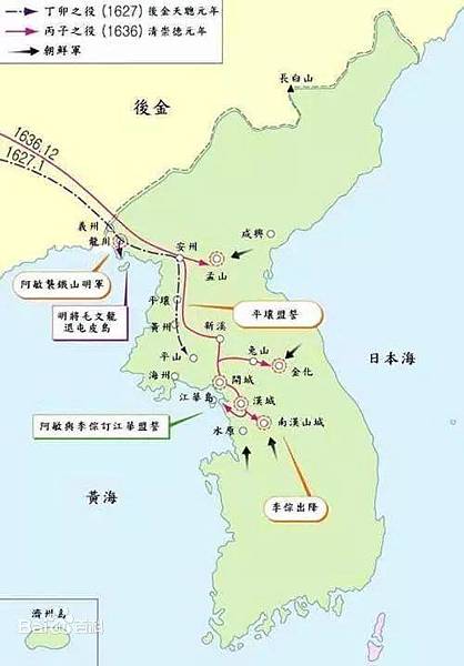 丁卯之役後,後金與朝鮮確立了"兄弟之國"的關係。 1636年(明崇禎九年,清崇德元年)後金大汗皇太極自稱皇帝,國號大清,朝鮮拒絕承認,兩國矛盾升級,引發皇太極統帥大軍親征朝鮮。 清軍渡鴨綠江後,揚野戰之長,舍堅城而不攻,長驅南下,直抵朝鮮首都漢城(今韓國首爾)。 朝鮮國王仁祖李飯後逃至南漢山城,被圍四十余日後出城投降,在漢江南岸的三田渡向皇太極行三跪九叩之禮。 此後北韓斷絕與明朝的宗藩關係,成為清朝的藩屬國,隨即清軍在北韓軍的配合下發動皮島海戰,奪取明軍據點皮島,丙子之役的餘波至此告終。