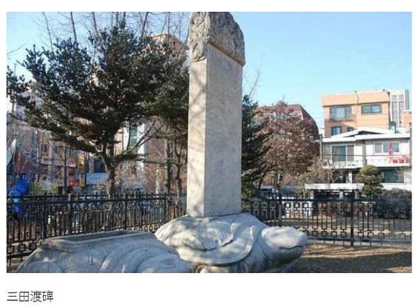 首爾市西南方,大約位於奧林匹克公園(올림픽공원)西南方約2公里處的松坡區石村洞(석촌동),有座三田渡碑歷史公園,公園內豎立著一座史蹟編號101號的「三田渡碑」(삼전도비,1639年,仁祖十七年豎立),此石碑又被稱為「大清皇帝功德碑」(대청황제공덕비)。